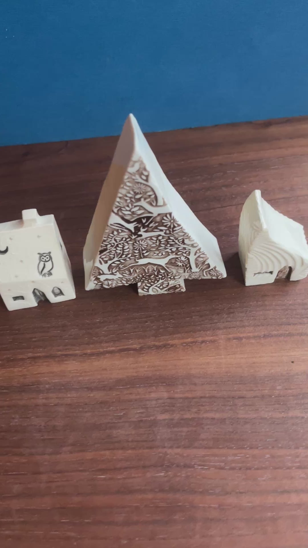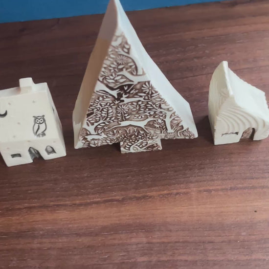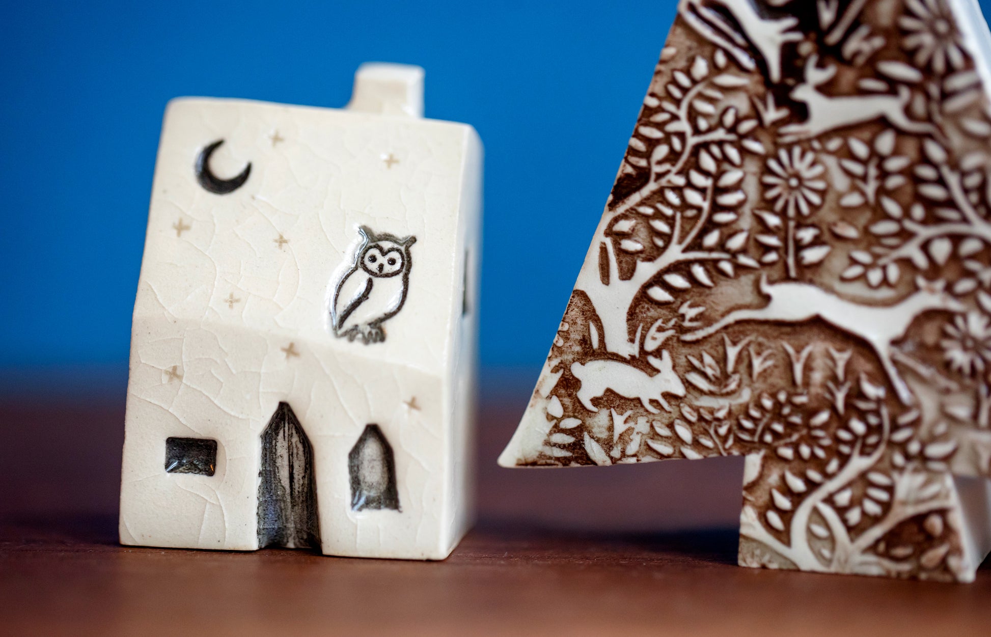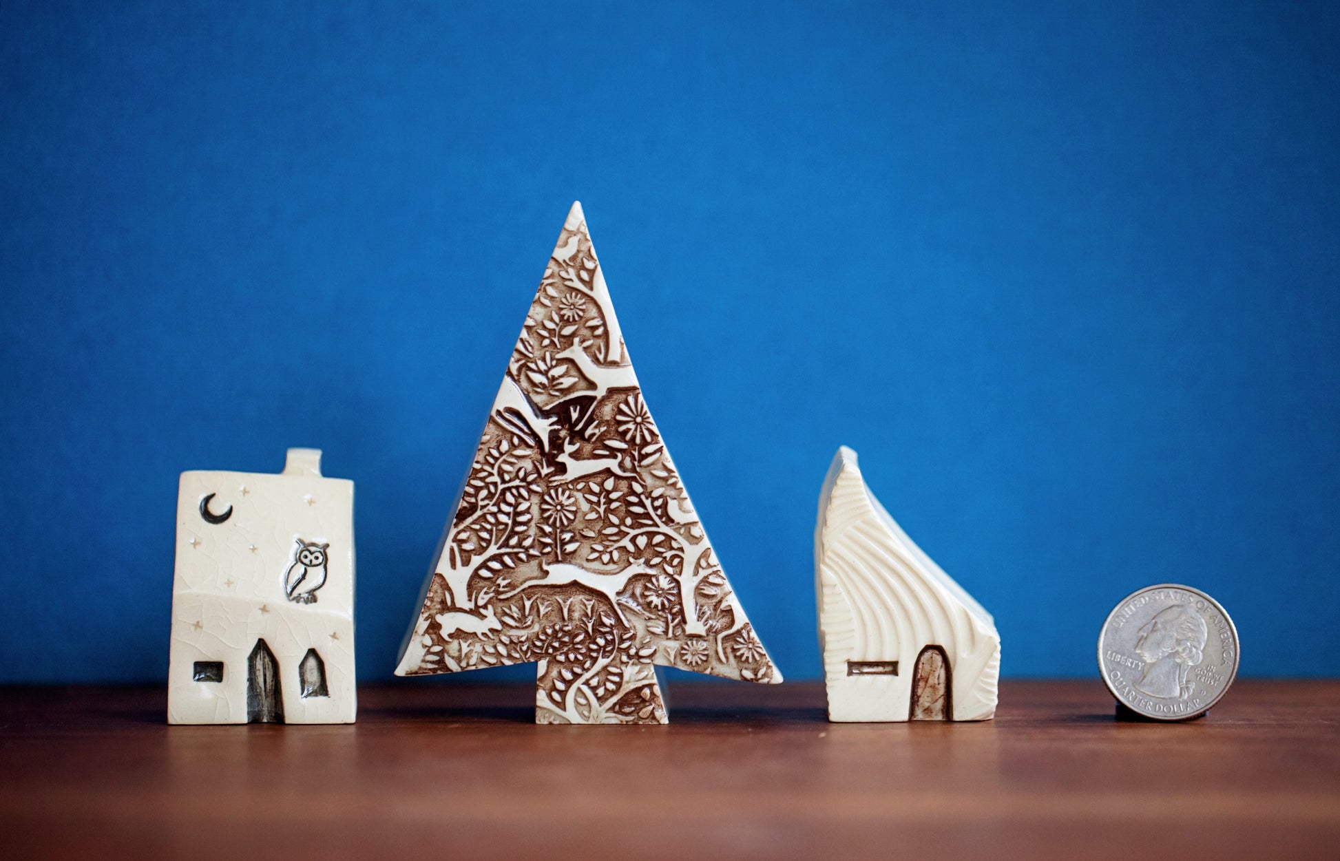 This is a little holiday village with a tall ceramic tree and two little white ceramic houses. I love the woodland pattern on the tree with deer, rabbits, birds and florals. I also love the little house with a sweet owl and crescent moon!