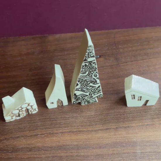 This is a modern style village of four ceramic houses and one tree with a woodland pattern. This would be a lovely artsy addition to the mantle. Each house has a different personality with intricate details. These are made from solid stoneware clay and have a heavy, sturdy feel in the hand. I use non-toxic underglazes for color and a non-toxic clear glaze finish. When put together, this village measures 5 inches wide and the tree is just over 3 inches tall.